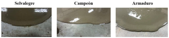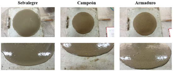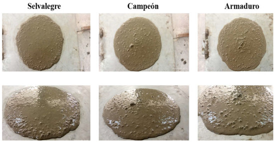The concrete formulations were designed following the recommendations given by Colegio Oficial de Ingenieros Civiles (Quito, Ecuador) (Table 3). As can be seen in Table 12, the flow time T50, i.e., the period between the moment the cone leaves the base plate and the concrete touches the circle with a diameter of 500 mm, and the size of the spread confirm they are SCCs according to the European Guidelines for Self-Compacting Concrete Specification Production and Use (EN 12350-1, 2011; EN 12350-2, 2019). Images of spread Abrams cone tests with the three concretes confirm the absence of bleeding (Figure 9).