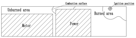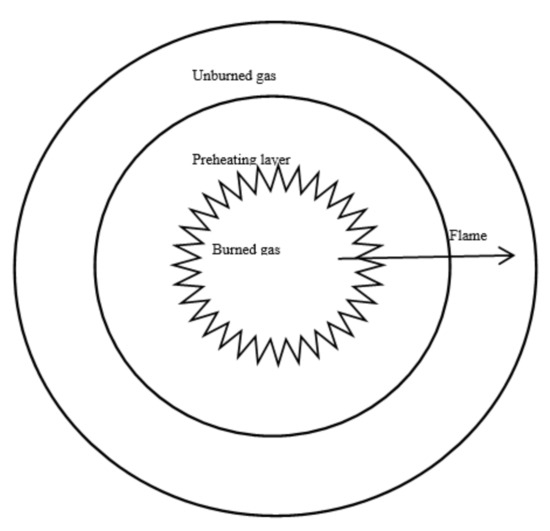 Essentially, gas explosion is a fast-transmission combustion process, which is transmitted by the flame produced in the process of igniting the local gas from the ignition source. The process has a strong chemical reaction on the interface between the burned gas and unburned gas, leading to the transformation of material and energy. The physical model of combustion can be idealized as shown in Figure 3.