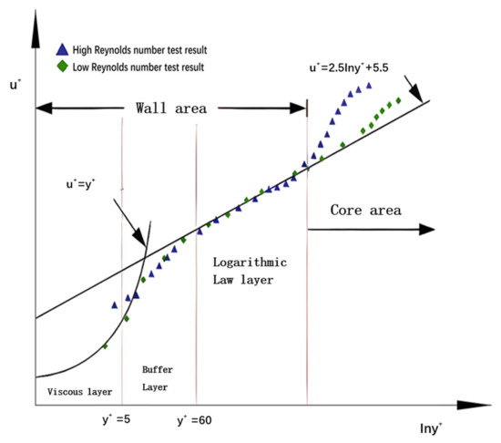 In order to describe the viscous bottom, transition layer of the wall area, the transition layer and the three sub-regions of the logarithmic law layer, two dimensionless parameters u+ and y+ are introduced, respectively representing the speed and distance.