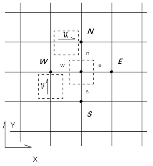 The two-dimensional model is divided into x and y directions, and the above Equations (3)–(6) are expressed as follows: