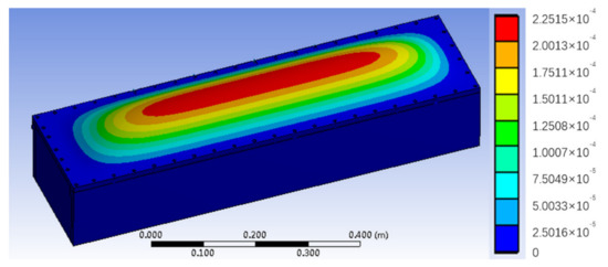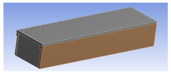 According to the standards, hydrostatic load should be 1.5 times of the maximum explosion pressure. In the design of the explosion-proof cavity, the design strength of the bolt of the explosion-proof cavity cover plate can meet the requirement, while the other plates of the surface of the cavity take the method of full welding. The box is simplified as an integral for analysis. The cavity material is made of 316L stainless steel, with yield strength = 310 mpa, density = 7930 kg/m3, elastic modulus E = 1.95 × 1011 Pa, Poisson’s ratio = 0.3. This is shown in Figure 12.
