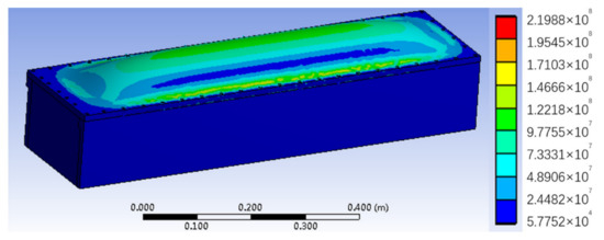 Afterwards, 1.2 MPa uniform distributed load is added to all surfaces of the box. The maximum stress of the cavity is shown in Figure 13 and Figure 14.