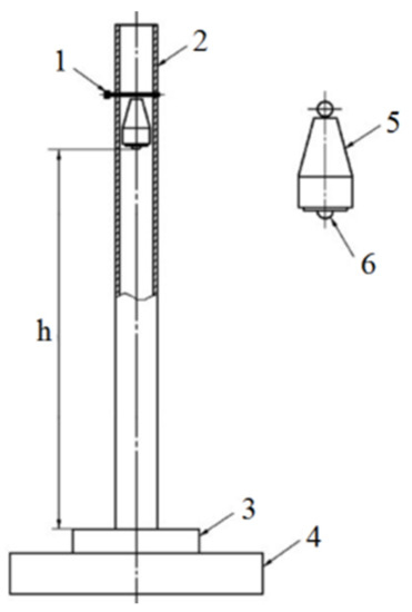 Schematic diagram of the testing equipment for impact test. 1. Bolt for adjusting height; 2. Tube; 3. Experimental sample; 4. Steel base (mass ≥ 20 kg); 5. Steel hammer block by quenching; 6. Hem-spherical steel punch by quenching of 25 mm diameter; h. Falling height.