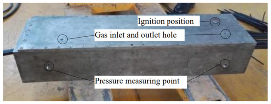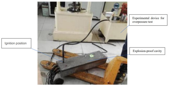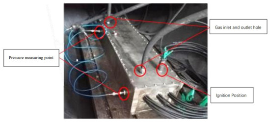 The original air inlet of the explosion-proof cavity is directly used as water inlet hole. Additionally, joints and other experimental auxiliary holes are processed by sealing treatment. Asbestos pads are used as the seal for connecting surface. The testing setup is shown in Figure 20.