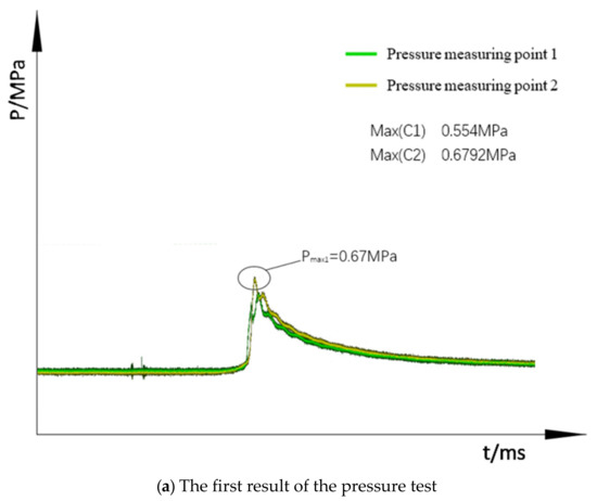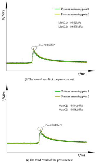 The test recorder recorded three test results as shown in Figure 19. Two curves in the diagram are the pressure curves measured at two pressure measuring points respectively.