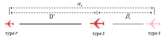 The MST matrix is used to avoid the wake-vortex effect and ensure the safety of the following aircraft (Xu [23]). As we known, heavy aircraft can generate and bear stronger vortex, while small aircraft just the opposite. Then we can divide the MST matrix into two parts, where denotes the ability of the leading aircraft of type r generating vortex and denotes the ability of the following aircraft of type s bearing vortex. Thus the new MST matrix is achieved by (see in Figure 2). Here, is the new rank 2 matrix, which is achieved by . is the aircraft type set, and suppose there are p type of aircraft.