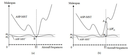 Makespan of sequences in ASP-MST and ASP-MST. (a) the optimal solution appear in point B; (b) the optimization process is to minimize .