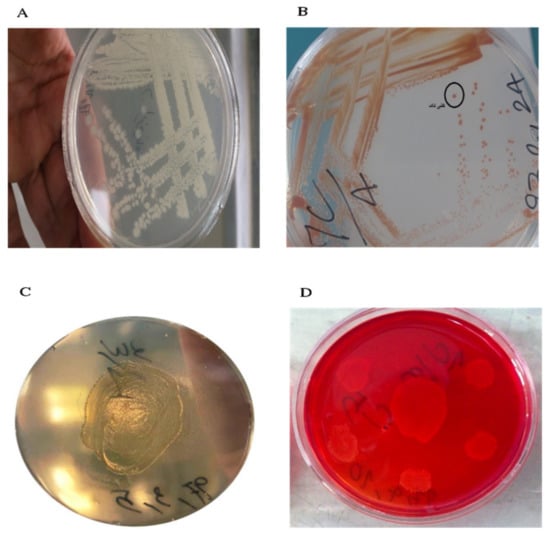 Linear culture colonies (A), single colony selection (B), growth of xylanase-producing bacteria in a specific solid culture medium containing xylan (C), and a clear halo around the colony of xylanase-producing bacteria using Congo red (D).