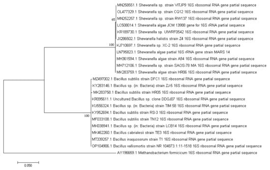In this study, potential bacteria-producing xylanase enzymes were identified by examining some morphological and biochemical characteristics as well as the 16S rRNA gene analysis. The boiling method was used to extract bacterial DNA []. The polymerase chain reaction (PCR) technique was utilized to amplify a 1500-bp fragment of the 16S rRNA gene using DNA samples extracted from potential xylanase-producing bacteria by specific primers, as follows: Fd1 (5′-AGAGTT TGATCCTGGCTCAG-3′) and Rd1 (5′-AAGGAGGTGATCCAGCC-3′) (Mankai et al., 2013). The PCR reactions were performed at the initial denaturation at 95 °C for 1 min, followed by 30 cycles at 95 °C for 20 s (denaturation), at 63 °C (hybridization) for 30 s, at 72 °C for 1 min (transcription), and at 72 °C for 5 min (final transcription). The PCR products were sequenced by the Sanger method DNA sequencing (Stab Vida Co. Spain).After sequencing the 16S rRNA genes of the isolated bacteria, the sequencing results were analyzed using the Chromas software and by their comparison with the database bank available in the NCBI (National Center for Biotechnology Information). Moreover, the Blast Online Tool (https://blast.ncbi.nlm.nih.gov/Blast.cgi accessed on 20 August 2022) was employed to analyze the similarities between the amplified genes and the other genes registered in this database. Then, the isolated bacteria were registered at the NCBI. Phylogenetic tree mapping of the 16S rRNA gene sequences of the isolated strains was performed using the MEGA X software, following the edition and alignment of the sequences using the neighbor-joining method. The evolutionary or phylogenetic analysis, along with two bacterial strains isolated from the green alga Ulva flexuosa and eight samples of sequences registered in the NCBI (most similar), were used to study the phylogeny. Methanobacterium formicicum (AY196659.1) was also used to create an outgroup branch when drawing a phylogenetic tree.