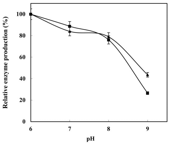 Optimization of xylanase production in HR05 (▲) and HR06 (■) at different pH values.