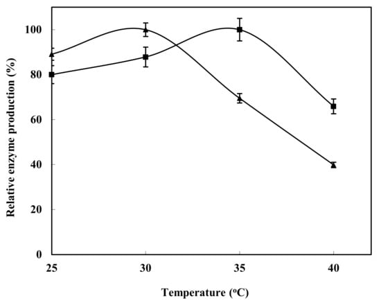 The highest enzyme production in Bacillus subtilis strain HR05 was reported to be at 30 °C, whereas the lowest production rate was observed at 40 °C. However, inalga Shewanella strain HR06, the optimum temperature for enzyme production was reported to be 35 °C, while the lowest enzyme production rate was detected at 40 °C (Figure 5).