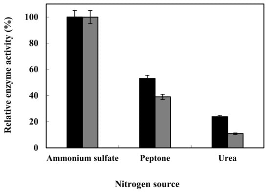 The highest enzyme production was observed when the two isolated bacteria were grown on the ammonium sulfate medium as a nitrogen source; however, the enzyme production rate began to decrease when they were cultured on a culture medium containing peptone and urea, respectively. The above results indicate that the two different xylanase-producing strains show a similar trend in maximum enzyme production in various nitrogen sources (Figure 6).