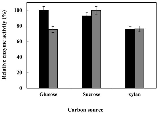 The maximum enzyme production in Bacillus subtilis strain HR05 was achieved in a glucose-containing culture medium, whereas the enzyme production rates were reduced when the bacterium was grown on sucrose- and xylan-containing culture media as carbon sources, respectively. However, alga Shewanella strain HR06 showed the highest enzyme production in the culture medium containing sucrose, while such a production rate was diminished in the culture medium containing glucose and xylan (Figure 7).