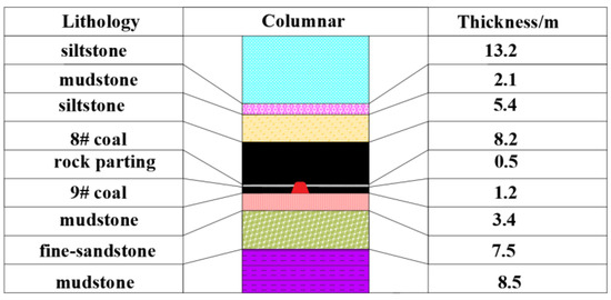 It is known from geological survey borehole data that the Luling coal mine 3811 heading face of the 8# and 9# coal merges in most areas. There is a gangue between the 8# coal and 9# coal. The thickness of the 8# coal seam is 1.8–14.25 m, with an average thickness of 8.25 m. The thickness of the 9# coal seam is 0.2–3.3 m, with an average thickness of 1.51 m. The coal seam dip angle is 13–22°, with an average dip angle of 16°. The gangue thickness between the 8# coal and the 9# coal is approximately 1.4–4.27 m, and the average thickness is approximately 1.2 m. The position of 8# coal and 9# coal in the section with the roadway is shown in Figure 1.
