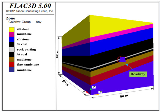 We used the engineering and geological data relating to the Luling coal mine heading face to study the development and evolution trends of stress, displacement, and plastic zones after roadway excavation. FLAC3D software (Minneapolis, Minnesota, MN, USA) was utilized to create models for the numerical calculations. According to the elastic–plastic theory, the influence range of roadway excavation was fully considered, and a range five times greater than the roadway radius was appropriately selected as the model boundary. In this model, the coordinate system was as follows: the X-axis was horizontal to the direction of the roadway excavation, the Y-axis was in line with the roadway excavation direction, and the Z-axis was vertical drift and upwards represented a positive value. The numerical simulation setting was = 50 m, = 100 m, and = 50 m. The upper part of the model was a free boundary, where other boundaries of the model were set as single constraint boundaries. The depth of the roadway was 600 m. Applied pressure on the upper boundary was = 14.25 MPa. The side pressure coefficient was . Firstly, the stress state of the original rock was simulated, and the displacement was reset to zero after the stress reached equilibrium, and then the roadway was excavated and calculated to achieve equilibrium. The cable structure was used to simulate the anchor rod and cable, and the beam structure element was used to simulate the support of the U-shaped shed. The calculations were carried out using the Mohr–Coulomb elastoplastic constitutive model in order to study the stress, displacement, and the development of the plastic zone at different positions in the process of roadway excavation. The location of the heading head was 0 m, 1.2 m, 2.4 m. Through numerical simulation, the stress environment of different positions in the process of excavation was understood, and the location prone to slip was clear to provide the theory instruction for the anti-slip site. We added geometry of the numerical simulation to make it easier to read. The revised part has been marked in red. In this numerical calculation, the initial geostatic stress was first balanced, and then the roadway was excavated. The simulated roadway was set as a trapezoidal roadway. The parameters of the model were calculated until a balance was achieved. The calculation model is shown in Figure 2.