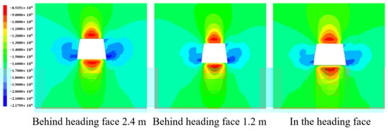 The xx-stress contour in the different ranges of heading faces is shown Figure 4. After roadway excavation, the horizontal stress at different ranges from the excavation head showed the same trend, and the stress values were significantly different. After roadway excavation, a certain range of the shallow surrounding rock formed a pressure relief area, the vertical stress concentration appeared in the roadway roof and floor, and the stress reduction area appeared at the side of the roadway as a result of excavation and was asymmetric because of the coal seam inclination. The reason for this was that the upper part of the roadway had a thick coal roof that was of low intensity and large inclination, resulting in coal and rock with low strength and fracture joints caused by mining. The roof and slope became increasingly loose and broken during roadway excavation. The concentration of horizontal stress led to the failure of the coal and rock mass near the roadway once it exceeded the ultimate strength, resulting in spalling the roadway excavation process. At the same time, stress reduction appeared at the coal–rock interface, resulting in the obvious difference between vertical stress and horizontal stress at the coal–rock interface. The stress distribution difference caused destruction and spalling in the coal–rock interface area. Therefore, the coal–rock interface area needed to be strengthened in the excavation process of this area.