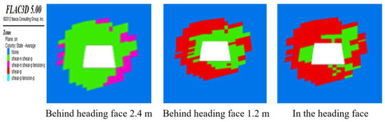 The plastic zone contour in the different range of heading faces is shown in Figure 6. At the position of roadway excavation, the failure mode in the near area of the roadway floor and roof was mainly a tensile failure. In the areas farther away from the roadway, the failures were in the form of past shear, present shear, and past tension. At a distance of 1.2 m behind the heading face, the area close to the roadway was mainly a shear failure, and the external area was a past shear failure. At 2.4 m behind the heading face, the two sides of the roadway along the dip direction of the coal seam showed shear failure, and a past shear failure appeared in a large area of the roof and floor. The main reason for this was that the original three-dimensional stress state was changed into a two-dimensional stress state due to the generation of the free face after the excavation of the roadway, This greatly reduced the strength and bearing capacity of the surrounding rock, which specifically showed that the coal and rock mass at the top and side was loose and broken, and the side was prone to spall.