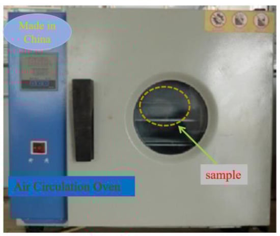 We took raw coal samples from the coal seam of the excavation roadway and sealed them to ensure they were in pristine condition for moisture content testing at the laboratory. The original moisture content of the coal refers to the ratio of the moisture content of the coal in the natural state to the solid mass. The original moisture content of the coal was measured according to the determination method of physical and mechanical properties of coal and rock GB/T23561.6-2009, and the preparation of coal samples was in accordance with Geotechnical test method standard (GB/T50123-1999). Firstly, coal samples with a particle size not greater than 6 mm and a weight of 1 g, were into the drying oven. These were heated at 105~110 °C for 24 h and then weighed, and the moisture content was calculated according to the mass loss of the coal samples. Experimental equipment included: an electrothermal drying oven with an automatic temperature control device and blower, balance (precision 0.001 g), ring knife, and plastic wrap. The electric drying oven is shown in Figure 7.