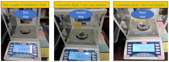 In the formula: is the weight of the volume bottle, the unit is g; is the weight of the volumetric flask and the original coal sample, the unit is g; and is the weight of the volumetric flask and coal sample after drying, the unit is g.