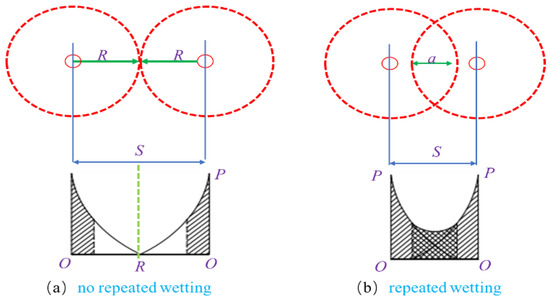 In the formula, is the water injection hole spacing, the unit is m; is the wetting radius of coal, the unit is m. Figure 9b shows the repeated wetting method. This water injection method was most often used in actual production to ensure full wetting of the coal, but with this method, the water injection limit could easily be exceeded, and the water injection volume was critical. According to the wetting characteristics of water and the nonlinear reduction law between water injection pressure P and the distance between water injection holes, the full wetting range of each water injection hole was approximately R/3 (the shaded part in Figure 9a), where the other 2R/3 ranges needed to be wetted repeatedly. The spacing of water injection holes was: