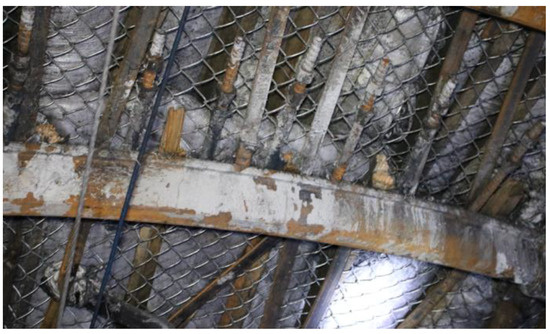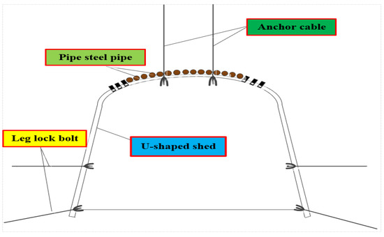 - In the roof coal seam, the advanced skeleton anchor bolt was driven under its cover as support. The length of the advanced skeleton anchor bolt was 3 m per section. The specific requirements were as follows: The layout position of the advance skeleton anchor bolt was closed to the top of the head-on U-shaped shed beam, and the construction was carried out using an air drill, an anchor drill, and an air hammer. The spacing between the advanced skeleton anchor bolts was 100~150 mm. The skeleton angle and direction of all advanced skeleton anchor bolts were consistent to ensure that a plane was formed which was at an angle of 3~5° to the roadway roof. After construction with the advance skeleton anchor bolts was completed, the steel belt and anchor cable were used at its tail end for reinforcement, and the angle between the anchor cable and the advanced skeleton anchor bolt was 65~80°. When the advanced skeleton anchor bolt was erected forward, the U-shaped shed beam should be close to the upper metal skeleton. After construction of the stubble pressing position, the construction of the metal skeleton for the next section was carried out again under the adjacent U-shaped shed beam at the head, and the two adjacent U-shaped shed beams were erected by descending 150~200 mm in turn. Each group of advanced skeleton anchor bolts were constructed in a cycle of four sheds, and the steel belt and anchor bolts were used for secondary reinforcement between the third and the fourth sheds. The depth of the anchor end of the anchor cable into the stable rock stratum was not less than 1.5 m, and the row spacing between the anchor cables was 1200 mm × 1200 mm (split layout). The layout of the anchor rod, the anchor cable, and the steel belt with the advanced metal skeleton is shown in Figure 11.