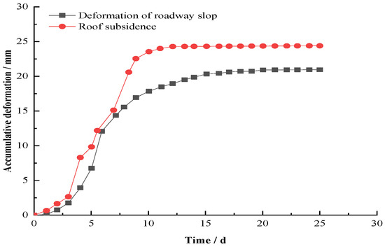The deformation of the surrounding rock in the early stage of roadway excavation was very large, and it was basically in a stable state after 25 days of construction. The cumulative amount of roof convergence was 24.8 mm, and the cumulative amount of convergence of the two sides was 21.5 mm, both within the scope of safety and controllability. With this support method, the phenomena of roof leakage and rib spalling during roadway excavation were reduced, the construction progress of the roadway was accelerated, and the safety and efficiency of roadway construction were guaranteed.