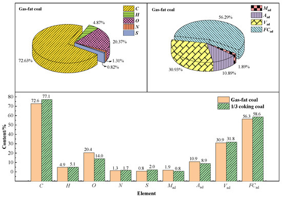 Coal is made up of organic matter and a small amount of minerals. A coal quality study revealed the fundamental elements and chemical makeup of coal [40]. The element proportion of the samples is depicted in Figure 1. Compared to oxidized 1/3 coking coal, the oxidized gas-fat coal has less C, Vad, and FCad. It implies that 1/3 of coking coal has a high rank. On the contrary, the difficulty of absorbing oxygen resulted in high-rank coal holding less O content than the lower one. Because of the pre-oxidation, the moisture content of coal decreased.