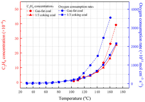 C2H4 was the product of spontaneous combustion at the crack temperature [34]. Gas-fat coal and 1/3 coking coal generated C2H4 at 110 and 100 °C, respectively. It corresponded to the concentration of CO increasing rapidly. In addition, the gas concentrations of 1/3 coking coal were lower than gas-fat coal as it had a higher rank.