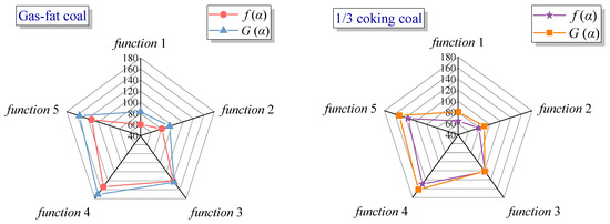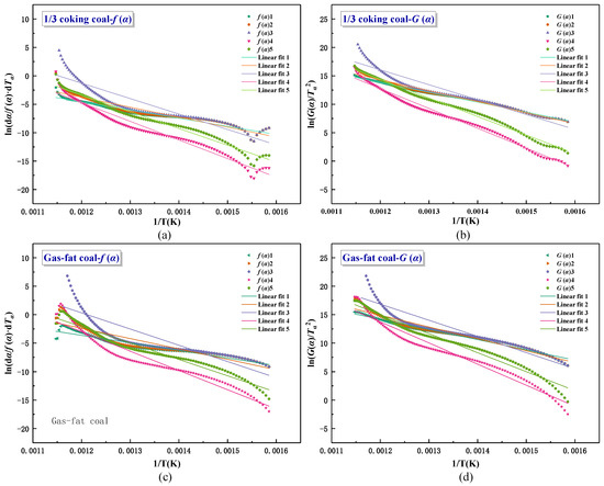 where α is the conversion rate, β is the heating rate, A is the pre-exponential factor, R is the gas constant which has a value of 8.314 J/(mol·K), Tα is the temperature corresponding to α, and f(α) and G(α) are differential and integrated kinetic models, respectively. The five mechanism functions of f(α) and G(α) we chose are listed in Table 2 [48]. The different f(α) and G(α) equations are substituted into Equations (3) and (4), and the Eα values can be obtained by linear fitting of 1/T versus ln(dα/f(α)dTα) and ln(G(α)/Tα2) [49]. The fitting curves of the two samples were shown in Figure 4. As can be seen from Figure 5 and Table 3, Eα values obtained by f(α)3 and G(α)3 are similar for both samples, which are regarded as optimal. The average values of Eα of gas-fat coal and 1/3 coking coal are 142.14 and 121.77 kJ/mol, respectively.