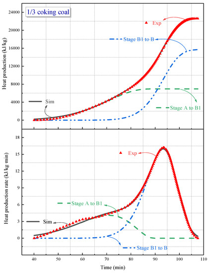 It is assumed that the thermal decomposition of oxidized coal is divided into two steps: A to B1 and B1 to B. Based on the DSC experimental data of 1/3 coking coal, the two stages were all simulated by the n-order model, and the results are shown in Figure 6. The consistency between the experimental and simulated curves indicates that the thermal decomposition reaction of 1/3 coking coal conforms to the two-step n-order reaction model. In addition, the heat production and heat production rates of B1 to B are more significant than those of A to B1, indicating that the second stage is dominant, and the reaction in the first stage promotes the reaction in the second stage.
