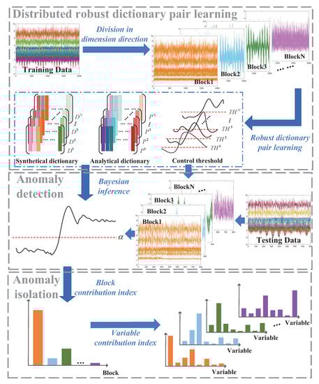 Therefore, to address the problem of process monitoring performance degradation caused by outliers and noise, we propose a robust dictionary pair learning method for industrial process monitoring. In addition, the proposed process monitoring method based on distributed robust dictionary pairs is developed for high-dimensional process data. The prior process knowledge is used to divide the training samples into blocks in the dimension direction, i.e.,