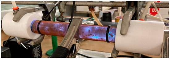 Low CO2 rates of decomposition have been found in the literature using pure CO2, whereas the use of Ar has been reported to be a good option due to the use of a diluent gas (gas to be ionized) increases CO2 conversion. When Ar is used, the main reaction pathway in the NTP zone involves Ar excitation and charge/energy transfer from excited Ar atoms to CO2 molecules [41]. Mei et al. [28] reported that Ar dilution is beneficial over other gases such as N2 and He. They observed that CO2 conversion increases with increasing Ar concentrations. The reason is that by decreasing the dielectric strength of the gas mixture, more energy is available for CO2 molecules in the discharge. In addition, the available electrons may excite CO2 molecules contributing to reaching higher conversions due to the lower number of CO2 molecules with respect to the Ar atoms. Mei et al. [28] also reported selectivities for CO2 conversion into CO in high Ar concentrations between 90–98% that increased at increasing Ar concentration. For that reason, Ar was used as diluent gas in this work. At the studied conditions, when voltage was applied between the two electrodes in the DBD reactor, NTP discharges were produced within the plasma reactor, as Figure 2 shows. It was observed randomized discharge points within the DBD plasma reactor that continuously changed. The NTP was fast generated or stopped by switching on or off the AC high voltage power supply, quickly reaching the steady state as suggested by Pou et al. [40].