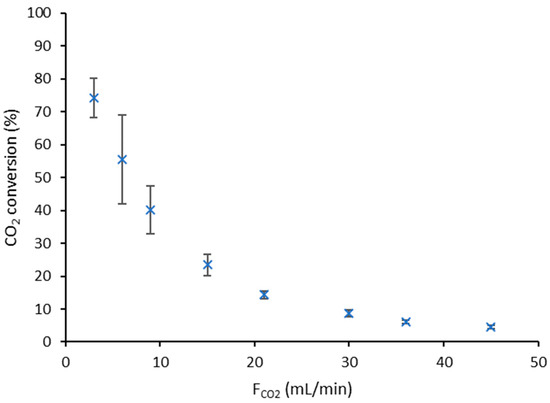 The effect of the CO2 flowrate on the CO2 conversion and energy efficiency was evaluated. In Figure 3, it can be observed how the CO2 conversion decreased by increasing the CO2 flowrate in the inlet. According to previous research [40], it has been proved that the generated NTP is more uniform at high Ar concentrations. In addition, at lower CO2 flowrates, the residence time in the reactor was higher and this would increase the probability that a NTP discharge could affect a CO2 molecule. This behavior has also been described using a fluidized bed NTP reactor with Cu/γ-Al2O3 powder-based catalyst [40]. The maximum CO2 conversion in this work was 74.2% and it was obtained at the lowest CO2 flowrate. This conversion was much higher than the one obtained by Ray et al. (maximum conversion of 15.7%) utilizing a packed DBD plasma reactor with Ni and Cu oxide supported γ-Al2O3 as catalyst [43]. Other works (Table 1) reported conversions ranging between 12–38.3%. In addition, the maximum conversion obtained in this work is much higher than the previous results obtained by our research group with a fluidized bed reactor and a Cu/γ-Al2O3 catalyst (a maximum conversion of 40% was reached) [40].
