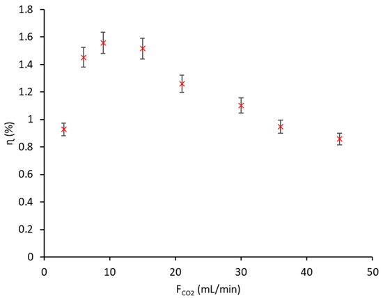 The CO2 flowrate shows an effect on the energy efficiency of the process, as can be observed in Figure 4. The maximum CO2 energy efficiency obtained in this study was 1.55%, using an Ar flowrate of 1 L/min and a CO2 flowrate of 9 mL/min. This value was similar to the results obtained with a fluidized bed reactor (1.3–2.0%) [40]; however, still less efficient than other works published in the literature working with DBD reactors that obtained energy efficiencies ranging from 7 to 45.2% (Table 1). The main reason to explain these differences in energy efficiency is caused by the different operational conditions (use of diluent gas, CO2 flowrate, catalyst, and power discharge). Probably, the amount of energy applied (power discharge) related to the CO2 flowrate used is too high compared with the literature. When the CO2 flowrate increased too much, the energy efficiency was affected by a lower CO2 conversion, as observed previously in Figure 3.