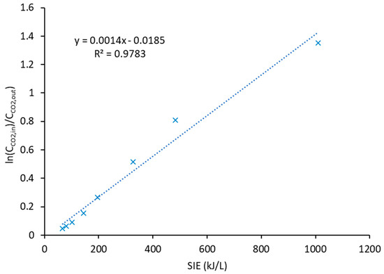 The conversion rate is expressed by k, and c stands for the intercept. Figure 5 reports the lineal increment of ln(CCO2,in/CCO2,out) as a function of SIE. The decomposition rate observed was of 0.0014 L/kJ. This value was lower than the value obtained by Ray et al. [43], who obtained a maximum conversion rate of 0.02889 L/kJ using 15% CuO/Al2O3 catalyst and without Ar dilution. They worked with lower values which can also affect the conversion rate. So, it is plausible that the difference between conversion rates is caused by differences in the operational conditions.