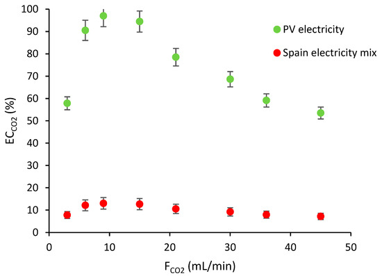 The assessment of the ECco2 was performed considering two different scenarios. The first scenario uses the electricity mix of Spain to run the DBD reactor, whereas the second scenario considers the current configuration of this work, supplying energy with a PV system. In Figure 7, it can be seen how the first scenario represents a lower compensation of CO2 emissions (between 7–13%). It can be noticed that it shows a similar tendency to the energy efficiency plot (Figure 4), as they are correlated; therefore, with this first scenario, the emissions derived from the electricity mix are much higher than those which can be counterbalanced by the CO2 captured and the CO produced during the DBD reaction. According to the Ecoinvent database, the emission factors related to the consumption of 1 kWh with the electricity mix of Spain and the production of 1 kg of industrial CO would be estimated as 0.131 kg of CO2-eq and 1.51 kg of CO2-eq, respectively.