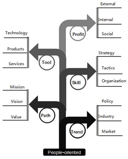 The business compass is a multidisciplinary and interdisciplinary theoretical framework for the top-level design of enterprise sustainable development. Business compass organically integrates Chinese philosophy and Western management science based on the people-oriented development concept, refer to the five elements “wood, fire, earth, metal and water” in Chinese Taoist philosophy [], as shown in Figure 1, it proposes five core elements of “trend, path, skill, tool and profit” for the sustainable development of the enterprise, and progressively constructs fifteen sections, including policy, industry, market, mission, vision, value, strategy, tactics, organization, technology, product, service, internal benefit, external benefit, and society, as well as 119 corporate sustainable development management modules, including economic policy, industrial trends, corporate responsibility, strategic goals, corporate ecology, technological innovation, product development, blank procurement, quality management, company achievements, and entrepreneurship, which is a new multidisciplinary cross-theoretical framework for the top-level design of enterprise sustainable development []. The business compass guides all aspects of enterprise operation and has important guiding significance for personnel operation management, equipment operation management, financial operation management, product operation management, etc.