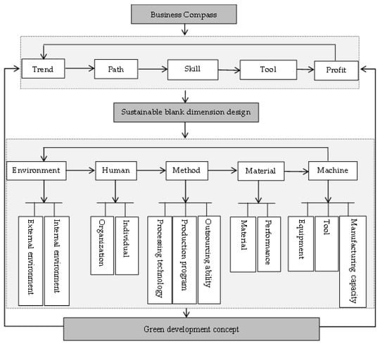 The business compass can provide guidance for the sustainable development of enterprises. In terms of blank dimension sustainable design, the “trend” is the environment in which a company conducts blank design. In recent years, the manufacturing industry has been developing in the direction of low-carbon and green manufacturing, and enterprise production must keep up with the development trend. The “path” is the purpose of the blank design, the goal of the enterprise is to produce a product, and the blank should be designed according to the product characteristics. The “technology” is choosing the appropriate blank dimension, which needs to be judged according to the product and the current technical level. The “tool” is production equipment, and the performance, parameters, and processing links of production equipment must be considered. The “benefit” is the profit of the product. The product benefits that the blank can bring and the problems it can solve. The business compass is a new way of integrating Chinese and Western management ideas to guide the top-level design of an enterprise. Its five elements of “trend, path, skill, tool, and profit” correspond to the five elements of blank dimension development “environment, human, method, material, and machine.” According to the business compass thinking—the concept of sustainable development of blank dimension—the internal connection of circular economy, the framework of sustainable design of blank dimension has been established, as shown in Figure 2.