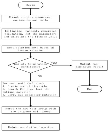 and are the ith wolf’s fitness values, respectively. and represent the maximum and minimum energy consumption, respectively, when the only optimization goal is to reduce the energy consumption of the manufacturing process. and respectively represent the maximum and minimum carbon emissions obtained when the carbon emission of the manufacturing process is taken as the single optimization objective, represent the weight of the corresponding item, and satisfy +. The analytic hierarchy process, the fuzzy evaluation approach, the expert scoring method, the group decision-making method, and other methods can be used to determine the weight.