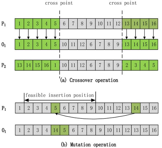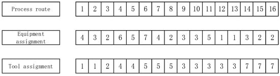 In order to solve the problem of process route optimization, the selection of equipment and tools and the sequence of processes need to be reasonably reflected in the part coding method in the algorithm. Each individual in the population has three substrings, including the workpiece process route sequence, equipment, and tools; the number of steps in the component is equal to the extent of the three substrings, as shown in Figure 4. The order substring represents the operation order of part processing in a continuous list, and its genes should take into account the constraints of processing priority. The equipment substring consists of the equipment number that has been assigned to each operation, and the jth gene on the substring represents the equipment used to complete operation j. The meaning of the tool substring is similar to that of the equipment substring.