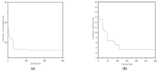 According to the energy consumption and carbon emission calculation model proposed above, some required equipment parameter information has been listed, and the GWO was used to optimize and solve the model. The parameters of the algorithm are as follows: population number is 100, maximum generation number is 500, crossover rate is 0.8, the mutation rate is 0.1, and the optimization goal is a low carbon and low energy consumption.