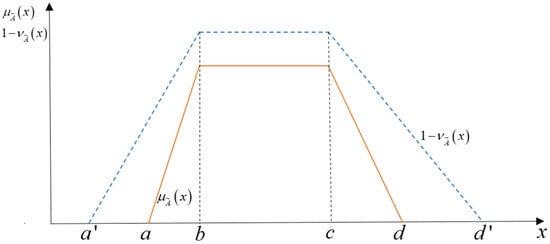respectively, where , , and . a′, a, b, c, d, d′ ∈ R, such that and four functions , , , are known as the sides of intuitionistic fuzzy numbers. In addition, , , are non-decreasing continuous functions, and , are non-increasing continuous functions. A set of intuitionistic fuzzy numbers can be defined when the four functions are linear functions, as shown in Definition 3.
