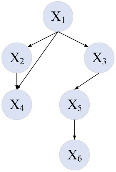 Figure 2 shows an illustration of a BN including six nodes. Node X1 is called the parent node of X2 and X3, whereas X2 and X3 are called the child nodes of X1. It is worth mentioning that X1 is also called the root node because it has no parent node. The complete united probability distribution of this can be expressed by Equation (16):