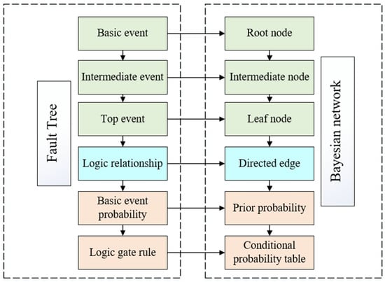 The determination of a BN structure is the first step in using it for prediction and diagnosis. There are several ways of constructing BNs: (1) expert knowledge-based [], (2) data-driven [], and (3) mapped from other models like the fault-tree, event-tree, or bow-tie models [,,]. The third approach is adopted in this study, where the potential accident scenarios of a system are first determined by a fault tree, which is then mapped into a BN according to the method shown in Figure 3.