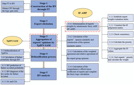 The proposed framework is mainly used to analyze the failure probability of process systems, which consists of five core parts—construction of the BN through FT, expert elicitation, aggregation of experts’ opinions by the TpIFN-SAM, the defuzzification process, and BN analysis—and is shown in Figure 4. The specific analysis process is described from Section 3.2, Section 3.3, Section 3.4, Section 3.5, Section 3.6 and Section 3.7.