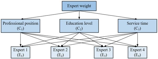 There are some general deviations in the experts’ judgements on the same event. This situation is affected by their professional position, educational background, and work experience. Therefore, a three-level hierarchical structure diagram of judging expert weights is established, as shown in Figure 5. Professional position, education level, and service time are accommodated as the evaluation indices of expert weights.