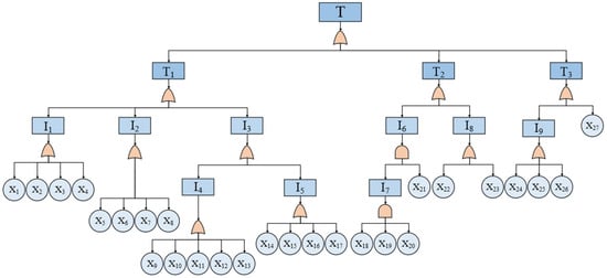 The conditional probability table (CPT) is another key component of BNs for implementing inference. During this process, the logical gate of the fault tree (FT) is used to confirm the CPT of each node in the BN. The logic gate rules of the FT describe the fault–logic relationship between parent and child events. Table 1 and Table 2 show the rules of how to obtain a CPT according to the two most critical logic gates of FT: the “AND” gate and the “OR” gate [].