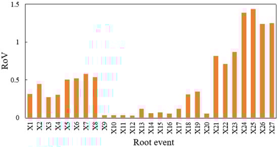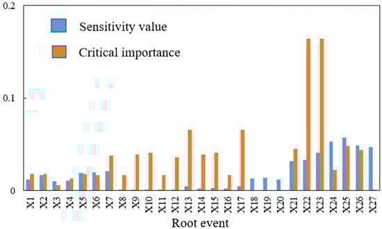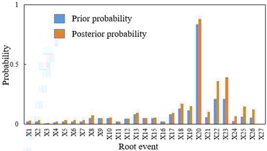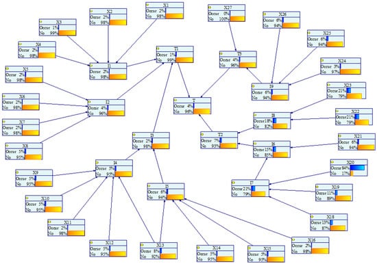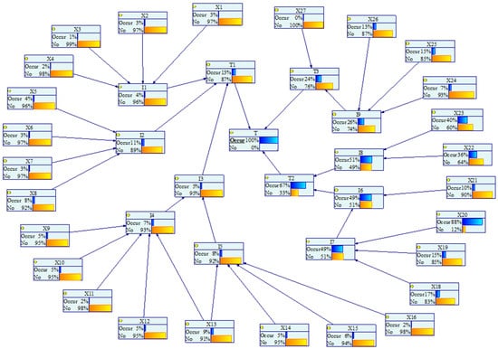 In the BN model, it has a forward (predictive) and backward (diagnostic) ability of inference. The forward inference is the inference from the causes (root nodes) to their effects (leaf nodes). Under the circumstances, new beliefs about this effect are obtained by using information about causes. In contrast, the backward inference is the inference on the contrary side (i.e., from the effect back to the cause). In this inference, the process of obtaining a new belief about causes based on known effects is continuously estimated and upgraded. Bayes’ theorem can be used to advance the diagnosis analysis of the BN model (see Equation (18)) [].