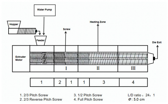 Rice protein was extruded by a co-rotating twin-screw extruder (DS32-III: Jinan Hisense Machinery Co., Ltd.; Jinan, China), as shown in Figure 1. The machine mainly consists of a feeding system, extrusion system, control system, and other units. The die is a circular die with a diameter of 5 mm. The length of the screw is 742 mm, and the diameter is 3.2 cm. The screw configuration is a building block structure, which is composed of a high shear kneading block with full pitch thread, 2/3 pitch thread, and 1/2 pitch thread. The barrel comprises three heating zones and is controlled by circulating cooling water. The extruder screw speed (100–250 rpm) and extrusion temperature (90–150 °C) were adjusted by a control panel. The moisture content of feed is regulated by a water pump (25–40%). As shown in Table 1, we divided the three groups of factors into four levels for the test, feed by single-screw feeder with a feed speed of 150 g/min. After the extrusions reached a stable state, the textured rice protein (TRP) was collected, and then dried at 50 °C for 8 h. The dried TRP was stored in PVE bags until further analysis. Before analysis, TRP was ground into fine powders (screened using a 200 mesh sieve).