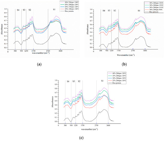 The FTIR spectra of the rice proteins are shown in Figure 2. The S1 region (3600–2750 cm−1) contains the vibrational absorption peaks of hydroxyl (-OH), amino (-NH), methyl (-CH3), and methylene (-CH2). The S2 region (1750–1250 cm−1) is mainly the amide vibrational region and the mixed region of a protein, fatty acid, and polysaccharide. The S3 region (1250–930 cm−1) is the characteristic absorption region of polysaccharide. The peaks in the S3 region (1250–930 cm−1) are characteristic of polysaccharides, while the S4 region (930–500 cm−1) is weak, but several small peaks are present, making it a fingerprint region. The range of maximum absorption peak wave numbers was essentially the same for the TRP compared to the rice protein; the characteristic absorption peak positions and characteristic fingerprints are the same, and the baseline trend is the same, but there is a great difference in the absorption intensity at the same peak position. This indicates that the chemical composition is essentially unchanged, with slight differences in vibrational intensities. Extrusion resulted in the changes in the chemical bonds and forces between the molecules, thus altering the spatial structure of the protein. Characteristic absorption peaks were present in the S2 region, but there was no significant difference between the characteristic absorption peaks of rice protein and TRP, and no new absorption peaks were formed. Therefore, no new amide bonds (i.e., peptide bonds) were generated in the protein after extrusion.